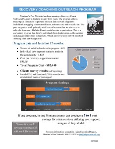 The Gallatin County Program was designed to divert individuals from high cost intensive or repetitive crisis services by providing two Peer Support Specialists available to all citizens of Gallatin County and engage those individuals in recovery. The Peer Support Specialists fostered partnerships with local behavioral health organizations and worked collaboratively to better address the needs of individuals in the community. Community-based peer recovery groups were created in Belgrade and Bozeman.