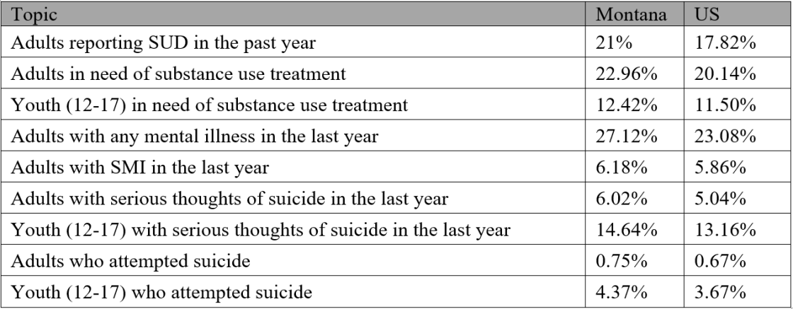 Montana mental health and substance use levels are generally higher than national averages and Montana often ranks near the top in suicide rates, substance use related deaths, and prevalence of mental health conditions. Individuals in rural and frontier areas are often underserved and under-resourced. The following table is taken from SAMHSA’s National Survey on Drug Use and Health.